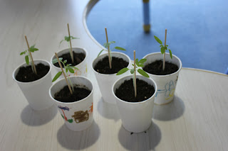 この日シャークスは、カップに蒔いたトマトの種から芽を出した苗を観察しました。